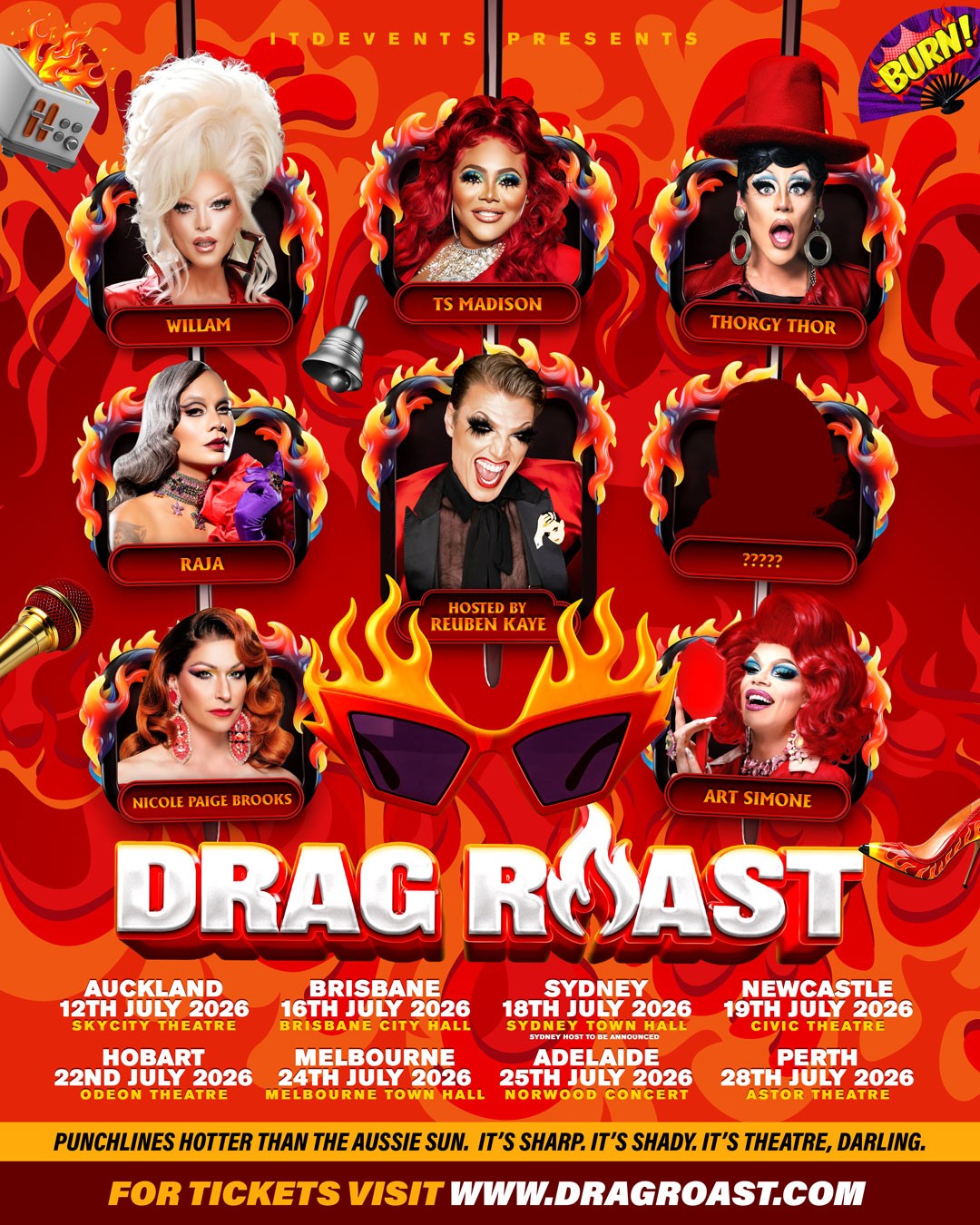 This July, The Drag Roast Tour — an Australian & NZ first — storms theatres nationwide, where glitter meets gut-punching comedy. The world’s fiercest and most notorious roasting queens will serve outrageous performances, jaw-dropping numbers, and scandalous stunts before trading glamour for gag-worthy insults and roasting each other (plus a few celebs you love to hate).
